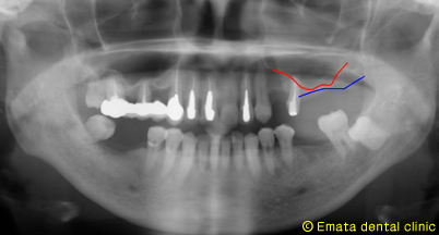 無事にインプラント埋入を終了した後の画像です。黄色いライン部分がサイナスリフトをした部分です。 |