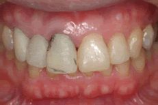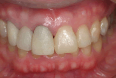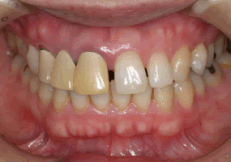 向かって左側の被せ物は色や形態もおかしく、歯肉も腫れています。右側は隙間が先天的にあります。バランス的に難しいですね。 |