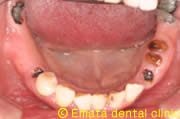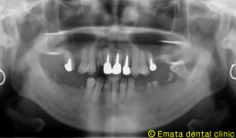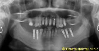 入れ歯は絶対いやなので、インプラント治療をご希望されました。恐怖心が強かったのですが、麻酔医専門医の協力のもと静脈鎮静法を併用してインプラント治療だったのでとても楽とうことでした。このあと左上の奥歯に骨造成(サイナスリフト)をしてインプラント治療を行う予定です。