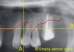 従来のレントゲン画像です。骨がだいぶ喪失(赤線)して抜歯の適応でしょうか。 |