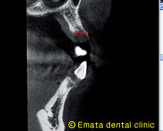 上記レントゲン画像のAのラインでのCTの断面です。外側の骨(赤線)が残っていることが確認できました。 |