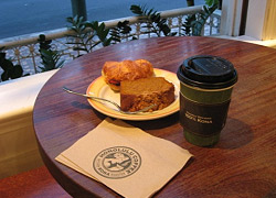 朝食は、1階のホノルルコーヒーカンパニーでとりました。コーヒー好きのわたしにとってはコナ100%はたまりません。 小さく開いてる窓からは、ハワイの心地いい風が流れてきました。 |