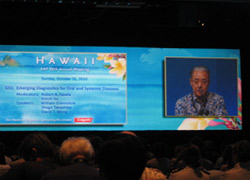 ジェネラルセッションの最初を飾ったのはインプラントではなく、歯周病と全身疾患との関係でした。インプラントに興味のある先生方(特に若い先生)は満足してないようでしたが、わたしは大変いいことだと思います。内容は全身疾患による口腔内合併症の診査・診断は歯科医がおこなうのが理想的で、歯周病の最新の画期的な方法が紹介されました。