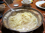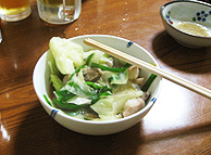 〆にはモツが染み込んだスープにちゃんぽん麺をいれ、焼きそばをつくるかように強火で煮汁がなくなるまで煮込むのには驚きました。 |
