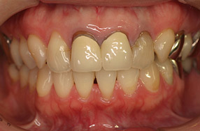 主訴:前歯の被せ物が劣化し、笑う時に差し歯の隙間が黒ずんで見えて口元が気になってしまう。前歯の見た目を奇麗にして歯の色をもっと白くしたい。