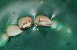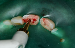 神経の露出した処置を行います。上の部分を少しだけ取って残りの部分を残します。部分的な断髄といいます。根の治療(歯内療法)をするときは必ずラバーダム防湿(緑の膜)をおこないます。感染防止のためラバーダムをしない根の治療はありえません。一番の成功のポイントです。 |