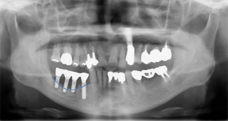 先日歯肉が腫れる、グラグラすると来院された患者さんのレントゲン写真です。 天然歯も重度の歯周炎です。そして向かって左側にインプラント周囲炎がおこり骨がなくなっています。