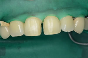 ラミネートベニヤでもコンポジットレジンでも接着修復ですので治療にはラバーダムは必須です。 |