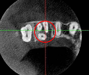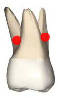 赤い部分が分岐部です。 最新の分岐部病変治療においてCT画像診断と、エルビウムヤグレーザー(歯や骨を削ることができる厚労省から認可されたレーザーです)を使用したエムドゲインによる再生療法で、かなり良い結果がでるようになりました。ただし、再生療法を成功させる上で、まず一番重要な事は『適応症・欠損形態を十分に吟味し診断する事』です。適応症を誤れば期待した再生の結果を得ることは出来ません。 |