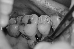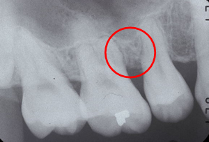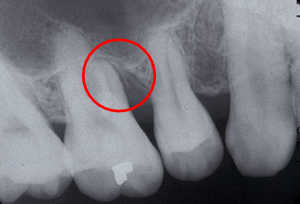 歯周治療の中でも、もっとも難しいものの一つに根分岐部病変というものがあります。これは複数の歯根を持つ大臼歯で起こる歯周炎で、「歯周病を制することは、根分岐部病変を制すること。」といわれるくらい、大変難しいのです。そのため、進んだ根分岐部病変が生じた歯は抜歯をすべきであるという意見を持つ専門医も少なくありません。