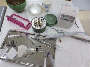 宿題として20本ほど抜去した歯牙を使用して根管拡大して根管充填処置をして送らなければいけませんでした。実習で抜去歯牙を根管充填したものを使用して根尖部の外科実習をマイクロスコープでおこなうためです。休診日や診療後におこない、これが結構大変な作業でしたが、自分のトレーニングにはとてもよかったです。20年数年臨床をやっていますがこんなに抜去歯で根管充填したのは始めてでしょう。