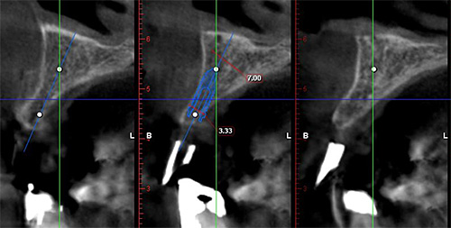CTデータをもとに、インプラントの埋入をシミュレーションし、精密な計画を立てます。前歯のインプラントで難しいのは、埋入位置が0,5mmと狂うと取り返しがつきません。