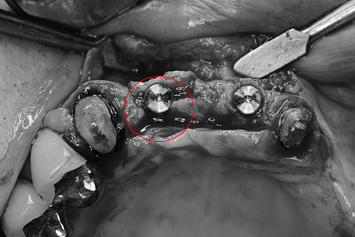 インプラント手術において一番頻繁に問題となることはインプラントを埋入するのに十分な骨量がないことです。とくに前歯は骨の高さには問題ないですが、幅が不足してることがおおいです。このようなとき骨の頂上部にクサビのような形の特殊な器具を挿入しながら、少しずつ骨幅を広げインプラントの埋入が可能な状態にします。スプリットクレスト法という骨造成法です。