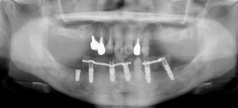 患者はインプラント治療を希望していても、歯を抜歯し義歯(入れ歯)を作成することから始めます。理由は咬みあわせを回復し、咬合を確認することと、義歯で対応できればそれでよいのですから。上顎の義歯は違和感があるものの使用はできましたが、下顎の義歯は違和感が強くまったく使用でいない状態でした。そこで、下顎にはインプラントを埋入し、完全固定式のブリッジを作成する計画を立てました。