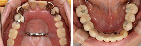 下顎に6本のインプラントにより固定式ブリッジになりました。ご自身の歯と同様に食事ができます。患者様も何十年ぶりに、きちんと食事もでき、審美的にも満足できると 非常に喜んでいただけました。現在上顎は義歯ですが、インプラントも考えているそうです。