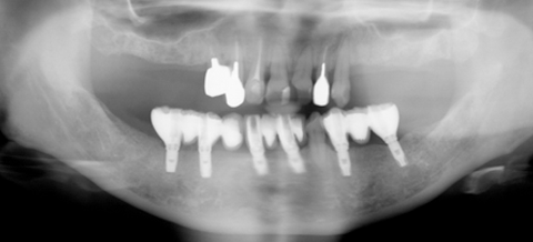歯周病の検査をすると特に下顎は歯を支えている骨は、ほとんど吸収してしまっている状態でした。患者様のご希望は、「きちんと噛めるようになりたい。再治療を繰り返すようなことはしたくない。将来的にも不安がない治療を行いたい。」とうことでした。