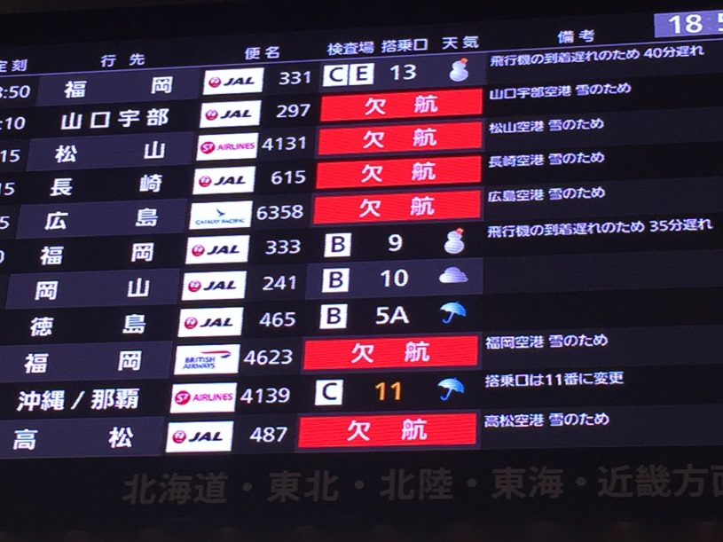 西日本は欠航は多かったのですが、福岡は1時間遅れの出発でした。