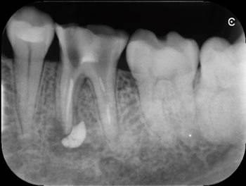 43歳 女性の患者さんが他の医院で根の治療をしてるが、痛みが引かないので来院されました。かなり大きな根尖病巣があり、そこに薬材が押し出しだされています。