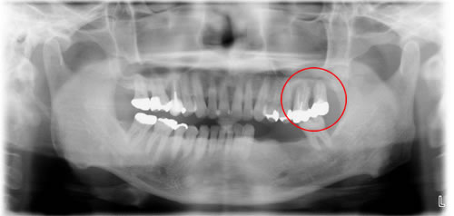 赤丸の部位が歯周病で歯が抜け落ちそうです。重度の歯周病によって、歯槽骨が吸収していくと、骨の幅や高さが減少していきます