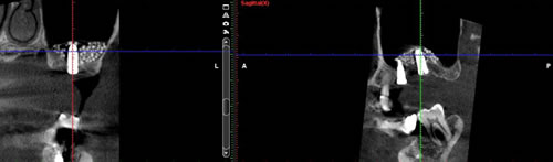 骨が約2mm程度しかありません。通常であれば、サイナスリフトをして6ヵ月後にインプラント埋入を行いますが、当院では2mmの骨があればインプラントを同時に埋入します。そうすることで治療期間を6ヶ月以上短縮することができます 。