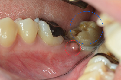 こちらの症例は、はぐきにニキビのようなものができた(赤丸)、ということで来院された患者様です。根の病気が悪化し骨を溶かして、歯肉の表面まで膿の通り道をつくる症状でフィステル、などと呼ばれています。一番近い青丸の歯が原因にみえます。