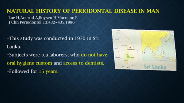 スリランカの茶畑で働く方々を対象に行われた調査です。当時の彼らには、歯をみがくという習慣はなく、もちろん歯科医院もありませんでした。つまり、一切の予防も治療もない状態でした。この環境の中で、歯周病がどのように進行するのかを15年間にわたり追跡し、その結果には驚くべきものがありました。