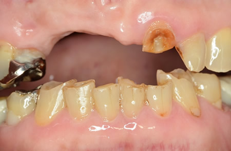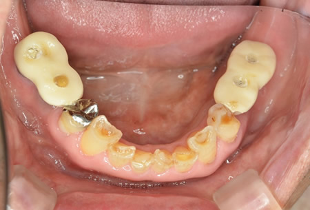 上顎の前歯、下顎奥歯の歯がない、すれ違い咬合です。入れ歯で相当苦労されていました。