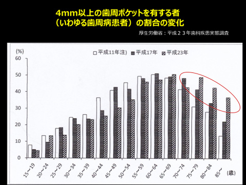素晴らしいことです。8020運動が全国で一生懸命展開された結果、達成できました。しかし下のグラフは歯周病の年代別の歯周病罹患率です。赤丸に注目してくだい。75歳以上の歯周病は増加傾向にあるのです。