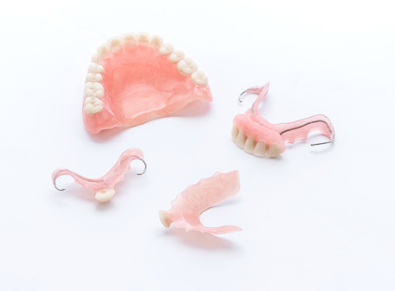 人工歯とプレートのような形をしている床(しょう)からなる着脱式の装置です。手術が不要で、トラブルが起きた際の調整や修理も比較的しやすいです。しかし装置が不安定であったり、見た目が不自然であったりするなど、たくさんのデメリットを伴うことから、治療後に不満を感じる方が多いのも入れ歯の特徴です。