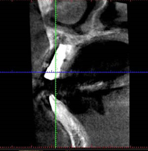 CT像です。歯根の周りには骨がありますので、抜歯即時インプラント埋入の適応です。