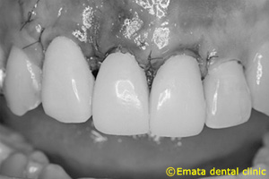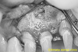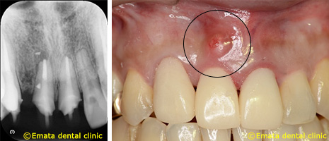 根もとに膿の袋(黒)ができています。切開やレーザーを照射しても再発します。レントゲンでは矯正をした歯なので、根の先が吸収しています。