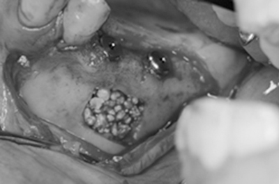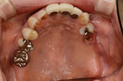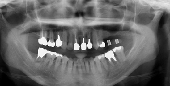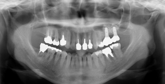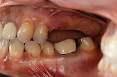 左上の欠損部分にインプラント希望の患者さんですが、骨が少ない為通常のインプラント埋入が不可能なケースです。他の医院では困難ということで、当院での治療を依頼されました。