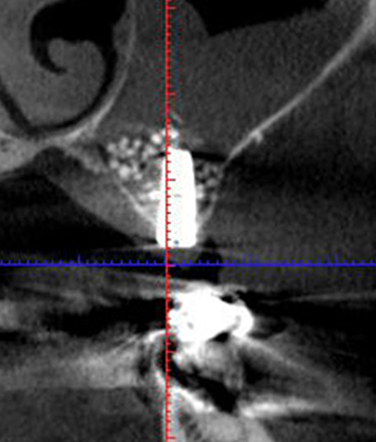 抜歯と同時にインプラント埋入、無切開で行く予定で、抜歯の部位とドリルを合わせています。