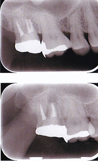 根管治療のレントゲン診査は2枚のレントゲン撮影(2方向)が必要です。赤丸に病変があり、根管充填が不完全です。