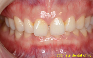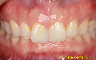 患者さんは25歳女性の方です。7月上旬に結婚式のためスキッ歯(正中離解)を治してほしいとホームページをみて来院しました。時間はないので矯正治療はできません。患者さんの要望は歯は削らないでほしいといことです。患者さんは正中離解のほか、歯が捻転してました。このケースは歯を削らないボンデッド(接着性)ポーセレン・レストレーションが有効です。