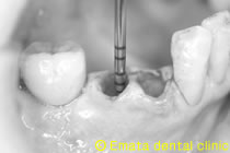 抜歯と同時にインプラント埋入、無切開で行く予定で、抜歯の部位とドリルを合わせています。