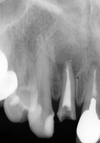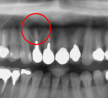 赤丸の前歯の腫れとお痛みが取れず,近歯科を受診しましたが、抜歯しないといけないといわれ当院を受診しました。患者さんはできるだけ歯を抜きたくないと強い希望がありました。