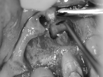 切断した、根断面をマイクロミラーで精査し、原因を究明します。 その後超音波ダイヤモンドチップで逆根管充填窩洞を形成しているところです。