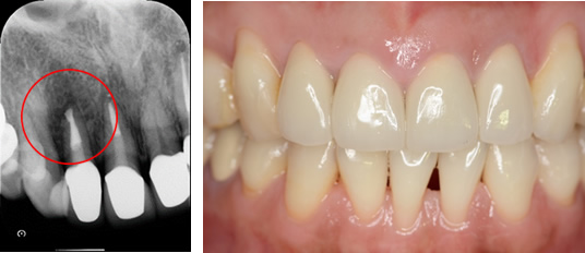 どんなに根の治療が良好になっても、被せものが歯とあってないと(不適合補綴物)、上部から感染をおこし失敗してします。よって精度の高いジルコニアオールセラミッククラウンで治しました。