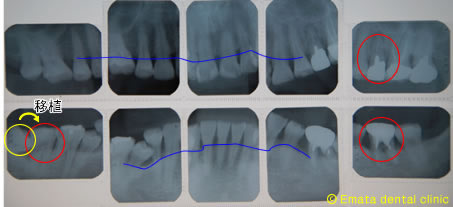 患者様は赤色が重度の歯周病、青色が初期から中等度の歯周病で来院されました。残念ですが赤色は抜歯の適応です。患者さんは健全な歯をけずりたくない、歯周病の歯にブリッジや義歯をいれ負担がかかりまた歯の喪失はいやなので、歯牙移植、インプラントを希望されました。