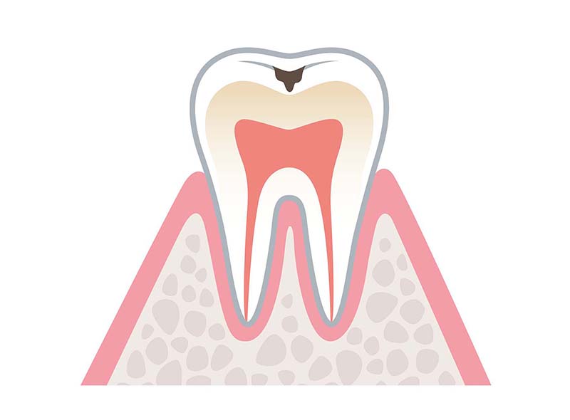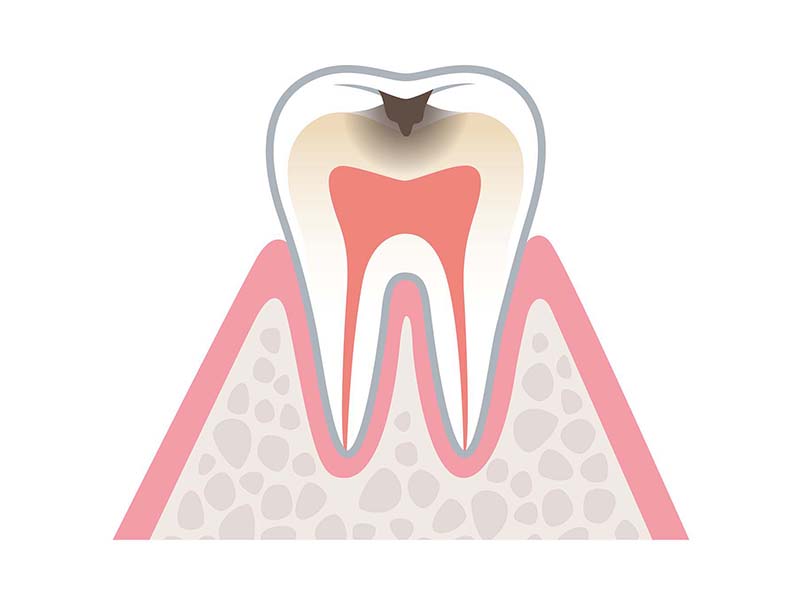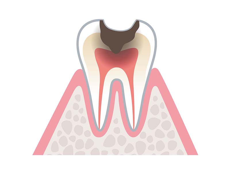 むし歯が進行し、エナメル質が溶け始めると、歯の表面に小さな穴が開きます。この段階では、むし歯を除去し、適切な詰め物で修復する必要があります。症例によっては、詰め物を行わず、定期的な観察を行うこともありますが、基本的には早期の処置が推奨されます