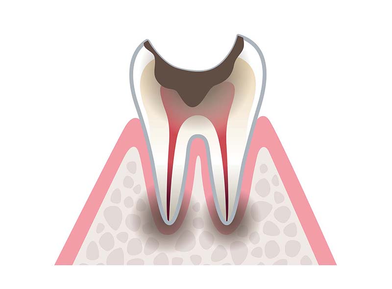 むし歯が象牙質まで到達すると、神経に近い部位まで細菌が侵入します。象牙質は神経との距離が近いため、温度変化などの刺激で痛みを感じやすくなるのが特徴です。この段階では、むし歯を除去し、適切な詰め物や被せ物で歯を保護しなければなりません。症状によっては、神経の除去(抜髄)が必要になるケースもあります