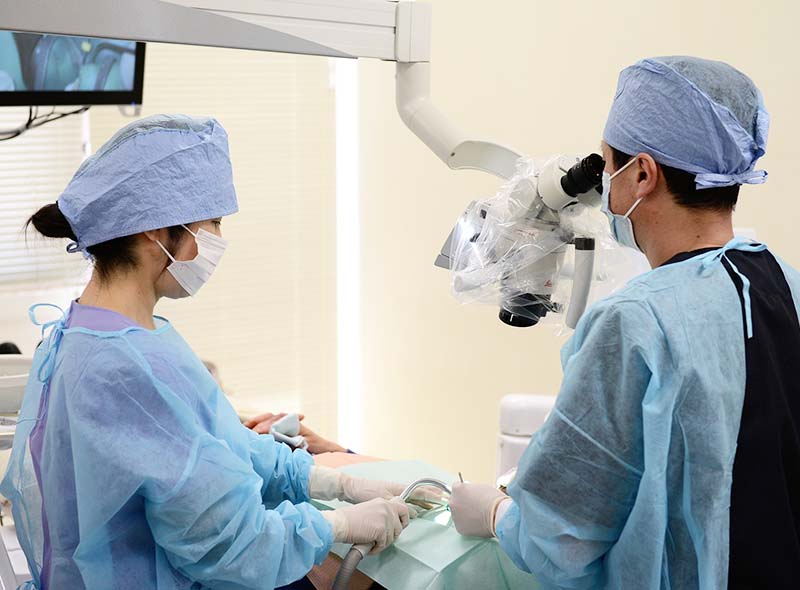 精密根管治療では1回の治療時間を長めにとり(最低60分以上)、治療回数は症例によりますが、2から3回で終了します。根の病気が治らないときは、外科的歯内療法という処置をおこないます。