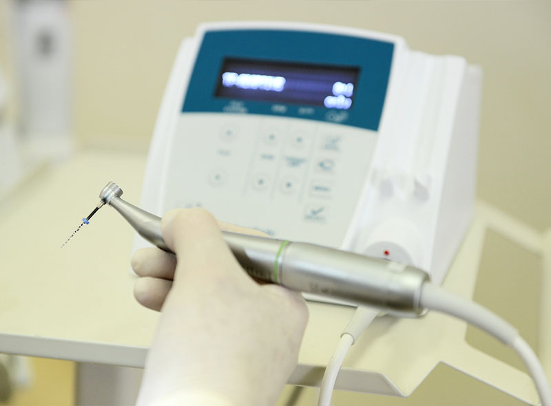 一般的な根管治療で使用されるステンレスファイルは固すぎるため根管を痛め直線化してしまいます。精密根管治療では十分な柔軟性を持ち、より神経を除去できるニッケルチタンファイルとアダプティブモーションを備えているエレメントモーターを使用し、しっかりと汚れをとりパワーを備え、ある一定以上の負荷がかかると一時停止・逆回転して、組織の削りすぎを防ぎます。