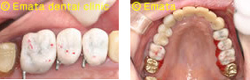 全顎的治療する場合や、歯の欠損が多い場合は噛み合わせにいろいろな問題点が生じ、適正な噛み合わせにしないといけません。プロビジョナルレストレーションという仮歯のようなものを口腔内に装着し治療していき、咬合の安定を厳密にチェックしていきます。歯を長持ちさせるためにいちばん重要な治療過程です。